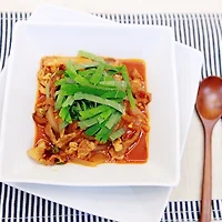 5. 팬에 식용유를 두르고 양파, 청, 홍고추를 차례로 볶다가 면, 사골부대찌개 스프(5g), 참치를 넣고 면수를 부으면서 2분 30초간 볶는다.