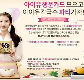 [이벤트] 아이유 행운카드 모으고 아이유 칼국수 파티 가자! "아이유 행운카드 모으고 아이유 칼국수 파티가자!" 후루룩칼국수 멀티팩 구매 시 멀티팩에 부착된 아이유 행운카드의 행운번호를 입력하시면 당첨여부를 바로 확인하실 수 있습니다!!총 30분께 아이유가 직접 끓여주는 칼국수를 드실 수 있는 칼국수 파티의 참여기회를 드립니다. ▷ 기간 : 5월 16일 ~ 6월 17일 ▷ 아이유 칼국수 파티 초대권 : 30명, 영화예매권(1인2매) : 100명 ▷ 이벤트 바로 가기 : "아이유 칼국수 파티 이벤트 바로가기" 클릭! ★ 제품을 구매하지 않고 카드를 부당취득하여 당첨될 경우 당첨이 취소될 수 있습니다.★ 1일 3회 응모 가능합니다.★ 행운카드는 한정수량으로 조기소진될 수 있습니다.★ 칼국수 파티행사는 변경될 수 있습니다.★ 이벤트관련 문의는 080-023-5181로 .. 더보기 이전 1 ··· 1046 1047 1048 1049 1050 1051 1052 ··· 1849 다음