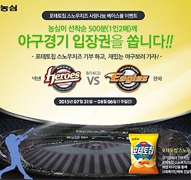 [이벤트] 농심 포테토칩으로 기부도 하고 야구도 보자! 농심 포테토칩으로 기부도 하고 야구도 보자! - 31일, 농심 공식홈페이지에 '사랑나눔 베이스볼' 이벤트 오픈 - 넥센vs한화 경기에 총 1,000명 초청, 입장권 대신 포테토칩 받고 제품은 기부 포테토칩으로 착한 야구보기에 동참하자! 야구도 보고 기부도 할 수 있는 프로야구 연계 기부행사인 '사랑나눔 베이스볼'의 참가 신청을 7월 31일부터 8월 6일까지 일주일간 농심 공식홈페이지(www.nongshim.com)를 통해 받습니다. '사랑나눔 베이스볼' 행사는 농심이 최근 출시한 '포테토칩 스노우치즈' 1봉지를 현장에서 프로야구 입장권 1매로 교환하는 방식으로 진행되며, 농심은 이벤트 당첨자 500명에게 8월 14일 목동야구장에서 열리는 넥센 히어로즈와 한화 이글스 경기를 관람할 수 있는 입장권(1인 2.. 더보기 이전 1 ··· 486 487 488 489 490 491 492 ··· 1849 다음