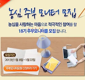 제18기 농심 주부모니터 모집 - 1월 8일~22일까지 전업주부 20명 내외 모집 - ㈜농심(대표이사 박준)은 고객의 의견을 최대한 수렴하여 꾸준히 사랑받는 제품과 서비스를 제공하기 위해 1월 8일~22일까지 제 18기 주부모니터를 모집한다. 18기 농심 주부모니터는 서울 및 수도권에 거주하는 만27세~만45세까지(1967. 1. 1 ~ 1986. 12. 31 출생자) 자녀가 있는 전업주부라면 누구나 지원 가능하며, 농심 홈페이지(www.nongshim.com)를 통해 접수한다. 선발된 주부모니터는 매장조사, 설문조사, 정기적인 오프라인 모임 등 다각적인 활동을 통해 농심 제품 품질 및 서비스 평가, 신제품 아이디어 제안 등의 활동을 하며 활동 기간 동안 소정의 활동비와 농심 제품이 제공된다. 활동기간은 3월부터 10월까지 8개월 간.. 더보기 이전 1 ··· 864 865 866 867 868 869 870 ··· 1849 다음