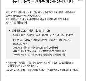 농심 우동류 관련제품 회수를 실시합니다 농심 우동류 관련제품 회수를 실시합니다 지난 10월 25일 식품의약품안전청이 농심 우동류 벤조피렌 관련 제품에 대해 회수를 실시하라는 권고가 있었습니다. 저희 회사는 고객 안심 차원에서 빠른 시일 내 관련제품에 대해 회수를 실시하기로 하였습니다. □ 해당제품(포장지 유통기한 표시 기준) - 얼큰한너구리: 2012년 10월 22일까지 ~ 2012년 11월 11일까지- 순한너구리: 2012년 10월 28일까지 ~ 2012년 11월 17일까지- 새우탕큰사발면: 2012년 11월 4일까지 ~ 2012년 11월 29일까지 2013년 1월 10일까지(부산공장 생산분) 당일 제품만 해당 2013년 1월 30일까지(부산공장 생산분) 당일 제품만 해당 * 위 회수대상 제품을 가지고 계신 고객 여러분께서는 농심 고객상담팀.. 더보기 이전 1 ··· 933 934 935 936 937 938 939 ··· 1849 다음