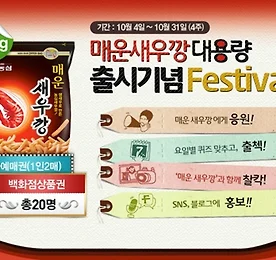 [이벤트] 매운새우깡 대용량 출시기념 Festival "매운새우깡" 대용량 출시기념 Festival!! 전국민의 간식으로 오랫동안 사랑받고 있는 새우깡!모임에서 함께 즐기기 좋은 '매운 새우깡' 대용량이 새로 나왔습니다.이벤트도 즐기시고, 추첨을 통해 드리는 선물도 챙기세요. 기간 : 10월 4일 ~ 10월 31일 (4주)당첨자 발표 일정 : 11월 7일 ["매운새우깡 대용량 출시기념 Festival" 바로가기] 이벤트는 총 4가지~ 이벤트.1 매운 새우깡 출시기념 응원메시지 남기자![이벤트.1 바로가기]이벤트.2 요일별 퀴즈 맞추고, 출석체크 하자!![이벤트.2 바로가기]이벤트.3 '매운 새우깡'과 함께 나만의 사진 찍자! (이벤트.3 은 18일부터 진행됩니다)[이벤트.3 바로가기]이벤트.4 매운 새우깡을 SNS, 블로그에 홍보하자![이벤트.4 바로가기] 더보기 이전 1 ··· 958 959 960 961 962 963 964 ··· 1849 다음